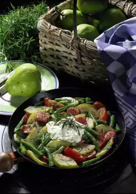 Clean, wash and cut the beans into pieces. Cook in boiling salted water with 2 stems of savory for about 15 minutes. Cut the sausage into slices. Wash, clean and slice the tomatoes.