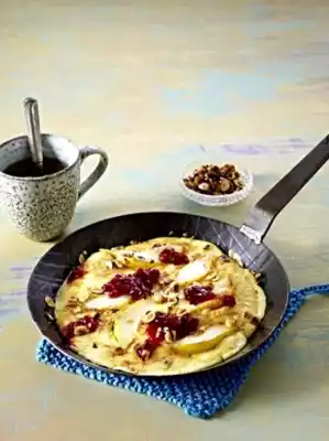 Heat a pan (18 cm Ø), add 1 1/2 tbsp. oil and place 5-6 pear wedges in it. Pour a little batter over it with a ladle and bake at medium heat. When the surface is firm, slide the pancakes onto a flat lid, turn them over and put them back into the pan.