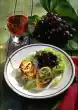 Prepare the second roll of ham in the same way. Wash and drain the salad. Cut the rolls into slices. Arrange on the salad leaves. Garnish with pear wedges and cress.