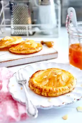 In the meantime, slowly warm up the jam in a small pot at low heat. Take the Tartelettes out of the oven. Allow to cool briefly, brush with liquid jam and sprinkle with flaked almonds.