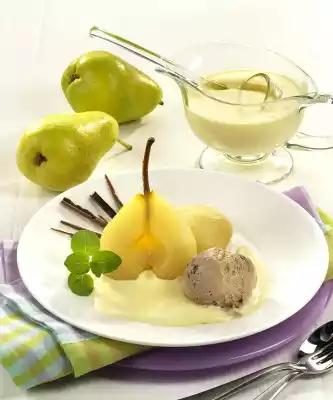 Whip the cream until half stiff. Mix the egg yolks in a bowl. Stir in wine stock and beat for about 5 minutes until frothy. Fold in cream. Arrange 2 pear halves each with wine mousse and ice cream. Decorate with mint and chocolate shavings