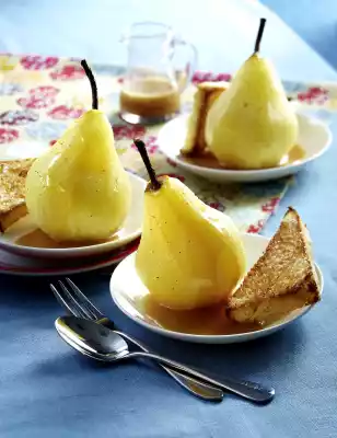 Remove the pears from the stove and let them cool in the stock, turning occasionally. Chop the caramel sweets and put them in a pot together with the cream. Bring to the boil while stirring (dissolving the caramel) and let it boil down for about 10 minutes. Stir from time to time. Let the toffee cream cool down, stirring in between