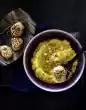 Sprinkle puree with nutmeg and arrange on portion plates with baked apples and mushroom sauce. Garnish as desired with a bouquet of herbs.