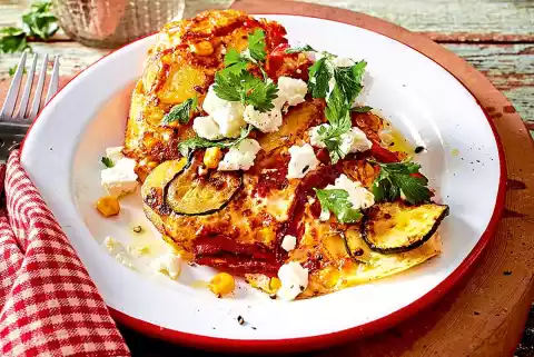 Heat 1 tablespoon of clarified butter in two pans. Fry each approx. 1⁄4 potato slices for approx. 5 minutes. Season with salt and pepper. Add approx. 1⁄4 each onion and zucchini and continue frying for approx. 3 minutes. Finally add approx. 1⁄4 paprika and 1⁄4 corn, heat briefly.