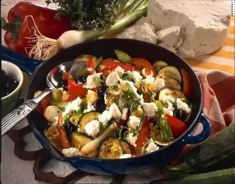 Feta cheese crumbles. Pour over the vegetables with the olives. Roast the toast and add