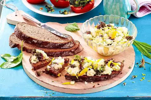 Coarsely mash 200 g of feta with a fork. Carefully wash and pluck 25 g of edible flowers (e.g. of marigold and dost). Add 2 tbsp.