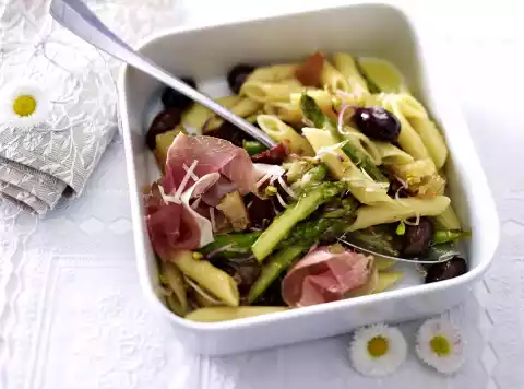 Wash the asparagus, dab dry, cut off the woody ends. Cut the asparagus in half first lengthwise, then crosswise. Peel onion and garlic and chop finely. Chop tomatoes coarsely. Put drained olive stock (1-2 tablespoons) and 4-5 tablespoons of oil in a pan and heat. Tomatoes, asparagus, onion, olives and garlic
