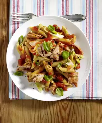 Cook the pasta in boiling salted water according to the instructions on the packet. Wash the basil, shake dry and pluck the leaves from the stalks. Drain tuna and pluck into pieces. Drain the pasta and return to the pot, fold in the sauce and tuna.