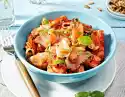 Peel onions and cut them into rings. Drain the tuna, heat the tuna oil in a pan. Brown the onions in it. Add tomatoes, corn, capers and 1 teaspoon of oregano, bring to the boil and simmer for 4-5 minutes.
