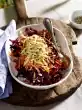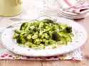 Cook the pasta in boiling salted water according to the instructions on the packet. Then pour into a sieve, quench well, drain and allow to cool. In the meantime clean, wash and coarsely dice the peppers.