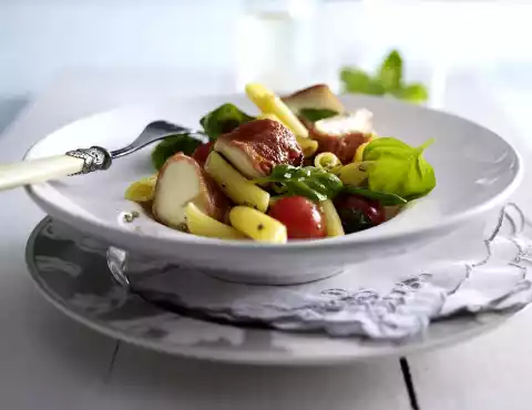 Mix the pasta, tomatoes and basil with the vinaigrette. Season to taste with salt and pepper. Cut the mozzarella parcels in half and arrange them on the penne salad.