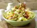 Drain the pasta, rinse with cold water for a few minutes and drain. For the vinaigrette, mix vinegar, salt, pepper and 1 pinch of sugar and fold in 3 tbsp. oil.