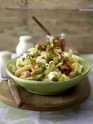 Pour the beans into a sieve and rinse with cold water. Cut the cheese into cubes. Drain the pasta and put it in a bowl. Mix beans, salsa, cheese and noodles. Season to taste with salt, pepper and vinegar.
