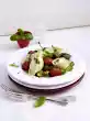 Wash basil, shake dry, pluck leaves from the stems and cut into strips. Mix tomato cubes, spring onion rings, basil, vinegar and oil. Season to taste with salt and pepper.