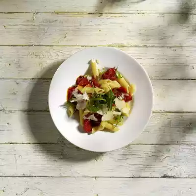 Wash and halve the tomatoes. Add cherry tomatoes to the sauce about 2 minutes before cooking. Drain the pasta. Wash and clean the rocket and put aside some rocket for garnishing. Coarsely chop the remaining rocket. Just before serving, add chopped rocket to the sauce and serve with the pasta.
