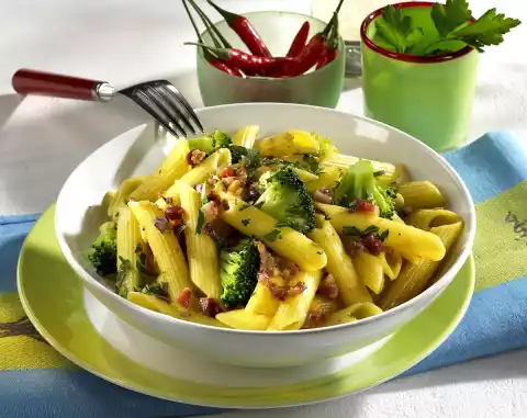 Add the broccoli florets 3-5 minutes before the end of the cooking time, depending on their size, and cook at the same time. Heat the oil in a frying pan. Fry the bacon in it. Add onions, garlic and crumbled chilli pieces. Finally, fry the anchovies briefly and remove from the heat.