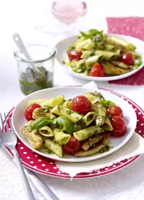 4 Cook the penne in boiling salted water, drain them quickly. Pour them into the pan over medium heat, adding the chicken and pesto. Mix and pour in the tomatoes, stir and serve immediately.