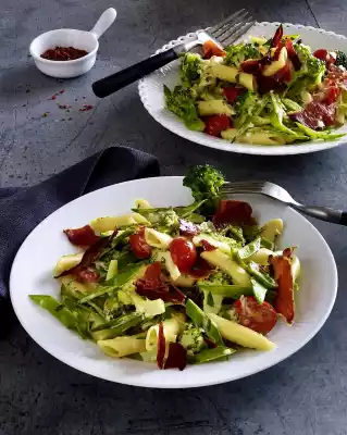 Prepare the pasta in boiling salted water according to the instructions on the packet. Place the ham on a baking tray lined with baking paper. Cover with another piece of baking paper and weigh down with a 2nd tray.