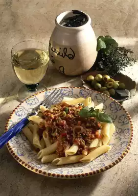 Add the olives. Season with salt, pepper and herbs. Simmer for about 20 minutes, stirring from time to time. Cook pasta in plenty of boiling salted water for 10-12 minutes. Flavour the finished sauce again. Pour pasta onto a sieve and drain.