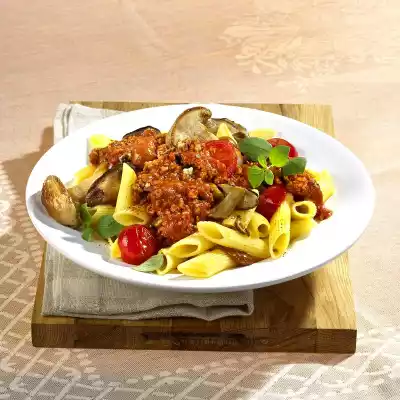 Cook the noodles in boiling salted water according to instructions on the packet. Add chopped mushrooms to the mince and fry briefly. Season with tomato paste, salt, pepper and paprika. Deglaze with strained tomatoes and tomato juice. Add tomatoes and fold in. Let simmer for 5 minutes. Season with salt, pepper and sugar. Wash oregano, dab dry and pluck leaves from the stalks. Add mushrooms to the sauce. Sprinkle with oregano. Serve with the noodles on plates