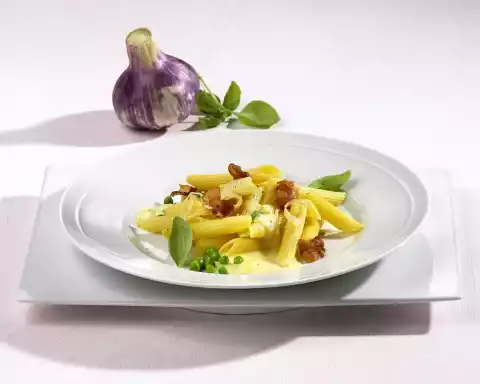 Cook the pasta in plenty of boiling salted water for about 15 minutes. In the meantime peel onion and cut into fine strips. Peel garlic and chop finely. Fry bacon in a pan without fat until crispy.