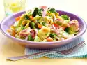 Add the peas and bring to the boil. Let simmer for about 5 minutes. Rip bacon into strips and add to the sauce. Season with pepper and lemon juice. Drain noodles and arrange on plates with the sauce.