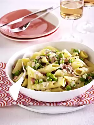 1 Cook the penne for about 10 minutes in a large pot of boiling salted water. Dice the ham. Drain the peas