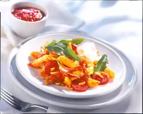 Clean, wash and quarter the peppers and place them on an oiled baking tray with the skin facing upwards. Heat in a preheated oven (electric cooker: 250 ° C/ gas: level 5) for approx. 15 minutes until the skin comes off. Meanwhile cook the pasta in boiling salted water for 10-12 minutes. Remove the peppers from the oven and peel off the skin. Put the paprika meat and oil in a high pot and puree with a blender.
