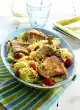 In the meantime, wash the fish, dab dry and cut into cubes. Clean the rocket, wash it and let it drain well. 2 minutes before the end of the cooking time, pour 150 ml pasta water into a ladle. Add peas to the noodles.