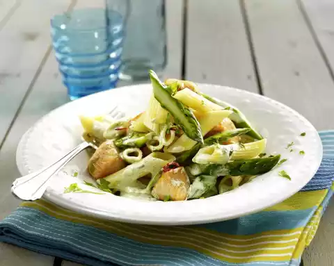 Season the sauce with salt and pepper. Mix salmon, asparagus, noodles and tarragon-mascapone foam and arrange on plates. Sprinkle with remaining tarragon.