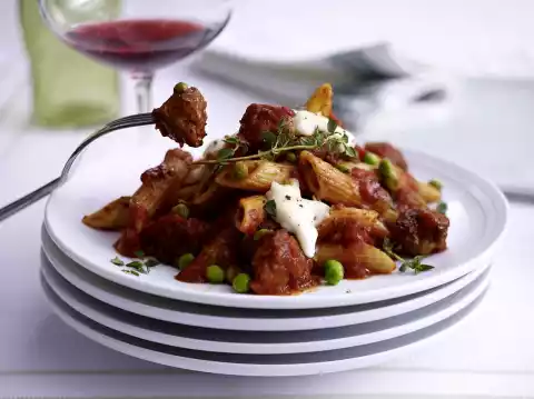 Pour penne into boiling salted water and cook according to package instructions. Add the frozen peas, salsiccia dumplings and thyme to the sauce and continue cooking for about 5 minutes.