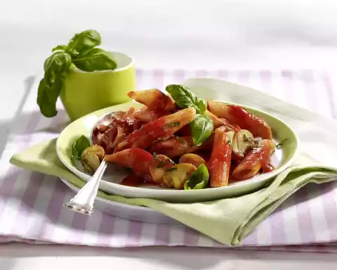 Heat the oil in a pan and fry the mushrooms in it. Add the strained tomatoes, basil strips and about 2 tablespoons of water. Season the sauce with salt, pepper and possibly 1 pinch of sugar.