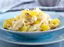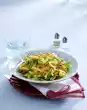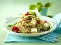 Drain the pasta and add to the sauce. Arrange the noodles and garnish with basil leaves.