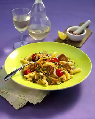 Prepare the penne in boiling salted water according to the instructions on the packet, drain and allow to drain. Clean, peel, wash and roughly grate the carrots. Clean, wash and chop spring onions. Peel garlic. Wash fish, dab dry and cut into approx. 2 cm cubes.