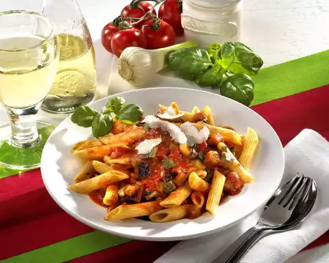 Heat the oil in a pot. Brown the onion and garlic. Add zucchini and eggplant and fry briefly. Add tomatoes and vegetable stock, bring to the boil and let it boil down for about 10 minutes. Meanwhile cook the pasta in boiling salted water for about 10 minutes. Drain and allow to drip off a little. Season sauce with salt, pepper and sugar. Arrange noodles with sauce. Peel the parmesan curls with a peeler and add them.