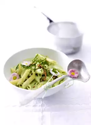 Take the pot from the stove, add the chopped wild garlic and puree finely. Stir in cream cheese and sour cream, season to taste with salt, pepper and 1 pinch of sugar. Warm the pasta in the sauce. Cut the remaining wild garlic into strips. Arrange the pasta, sprinkle with pine nuts and wild garlic and garnish with flowers