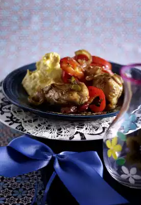 Mix 6 tablespoons oil, approx. 1 teaspoon salt, approx. 1⁄2 teaspoon pepper, 1⁄2 teaspoon cumin, 1 teaspoon oregano and chili. Wash meat and dab dry. Cut the chicken fillets into thirds and add to the marinade. Add paprika and onions.