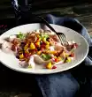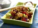 Heat a large pan without fat. Fry the chicken fillets, pepper strips and onions with marinade for 10-12 minutes while turning. Arrange pepper chicken with hummus. Flatbread tastes good with it.