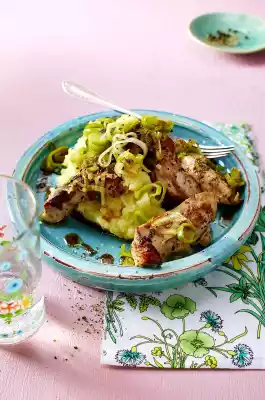 Mix about 2/3 leek into the puree. Arrange the puree and meat, sprinkle with the remaining leek, drizzle with sauce.