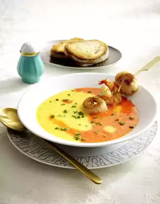 Heat 1 tablespoon of oil in 2 pots each. Fry red and yellow peppers separately. Add half onion cubes and half garlic and fry. Add half of the vegetable stock and simmer for 5-8 minutes at medium heat. Remove skewers from the marinade. Keep the marinade. Heat up a coated pan. Fry the skewers in the pan for approx. 2 minutes on each side, brushing with marinade in between. Wash the chives, dab dry and cut into small rolls. Add 3 tablespoons of cream to each soup, puree finely with a chopping stick, bring to the boil again, season to taste with salt, pepper and sugar. Pour both into smaller litre measures and at the same time run against each other in soup plates. Marble with a spoon handle. Arrange 1 scampi mussel skewer in each plate. Sprinkle soup with chives. Serve with baguette bread (ask the baker for lactose-free variety)
