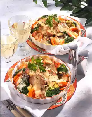 Arrange the vegetables in 4 small or 1 large casserole dish. Cut the fillets into slices and spread on top. Add the rest of the cheese in flakes. Pour sauce over the top and bake in a hot oven (electric cooker: 200 °C/ convection oven: 175 °C / gas mark 3) for approx. 15 minutes