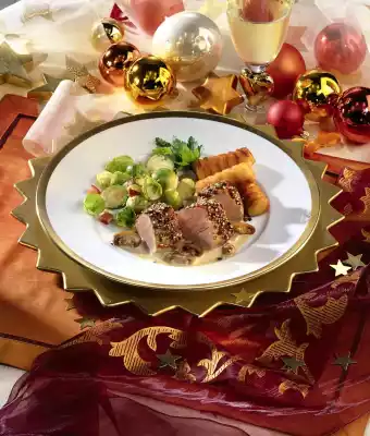 Clean, wash and slice the mushrooms. Peel and chop the onion. Remove the fillet and croquettes, keep warm. Fry mushrooms and onion in hot frying fat for 2-3 minutes. Stir in 100 ml water, bring to the boil and thicken. Stir in cream, season to taste