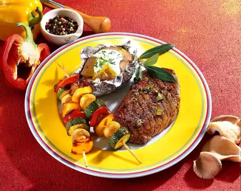Add the vegetable skewers a little later and fry while turning. Arrange the steaks and skewers with the sauce on plates and add a baked potato as desired.
