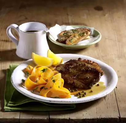 Keep warm. Meanwhile, heat oil in a pan, pat meat dry and fry on each side for 3-4 minutes. Season with salt and pepper. Remove from the pan and keep warm as well. Deglaze the meat with stock and orange juice, bring to the boil and simmer for 2-3 minutes.