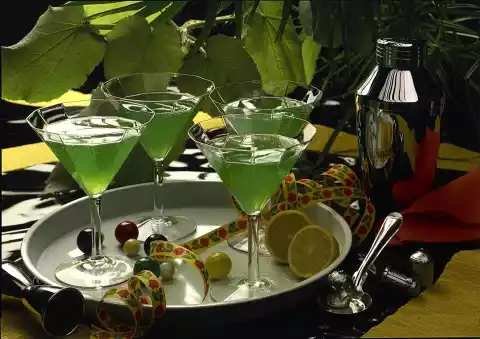 Put the peppermint liqueur, Cointreau and lemon juice in a shaker, add some ice cubes and shake everything briefly. Then strain into glasses and fill up with well chilled mineral water.