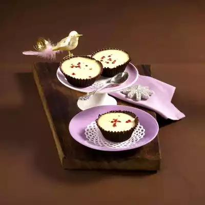 Place paper cuffs in 8 muffin tins and chill. In the meantime, chop dark chocolate coarsely and melt it on a warm water bath. Spread the inside of the paper cuffs with melted chocolate and refrigerate again.