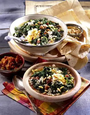 Fry the onion and garlic in it. Add kale and steam briefly. Season with salt and pepper. Deglaze with broth and bring to the boil. Add barley and raisins and cook over low heat for 20-30 minutes.