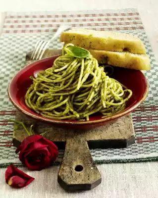 Bake in the preheated oven (electric cooker: 175 °C/ convection oven: 150 °C/ gas: level 2) for 15-20 minutes, remove from oven. Spread bread with remaining basil oil and cover with a tea towel until you eat it. Prepare pasta in boiling salted water according to package instructions. Drain noodles, collecting 2-3 tbsp. Drain noodles briefly and put them back into the pot. Add pesto and pasta water, stir and serve. Garnish with basil leaves. Cut bread into slices and add