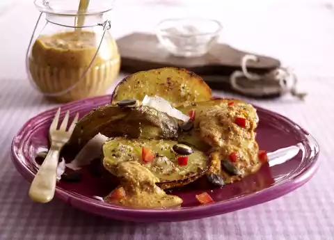 Pumpkin seeds, except for some roasted peppers, garlic, parmesan and 1 teaspoon of oil in a blender. Season to taste with salt, pepper and vinegar. Dice fresh peppers finely. Serve the potatoes with the pesto.