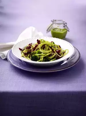 Wash and clean the broccoli and cut into florets. Wash parsley, shake dry, put something aside for garnishing. Clean and wash the radicchio and cut into fine strips. Prepare pasta in boiling salted water according to package instructions. Add the broccoli to the pasta about 5 minutes before the end of the cooking time and cook along